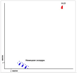 Mutual position of the K-21 and the German squadron at 17:25. Reconstruction
