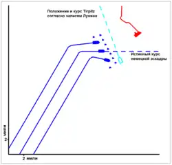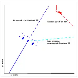 At 17:38, the Admiral Scheer, which is in the process of turning, is on a course aimed directly at the submarine at a distance of approximately seven miles. At 17:40, the K-21 submerges, sharply turning the rudder to the starboard side and, by 17:46, setting a new course, rapidly approaching the enemy. Concurrently, the submarine's watch log reveals a discrepancy between the course of the Tirpitz and other German ships and the information provided in German documents. At the time in question, the German vessels were facing the submarine with their bow or left cheekbone and were moving in a front-to-east formation, rather than in a north-northwest-bound column as indicated in Lunin's records. Given the implausibility of such a gross error occurring at such a distance (approximately five miles) in conditions of good visibility, the authors of the reconstruction have concluded that Lunin's fictitious parameters of the German squadron are the most probable explanation. According to the reconstruction, Lunin intended to attack the Admiral Scheer, but made a mistake, considering the intermediate course of 60° taken by the heavy cruiser in the process of turning for the new general course.[25]