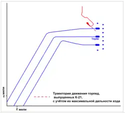 After a brief period of deliberation, Lunin reached a decision. At 18:01, he turned the boat to the left in order to provide the necessary angle of anticipation. At 18:01:30, he launched four torpedoes at four-second intervals from the stern torpedo tubes at the battleship Tirpitz. The watch log indicates that the distance between the K-21 and the battleship was estimated to be between 1.8 and 2 miles, which is close to the maximum range of the torpedoes. The reconstruction indicates that the distance between the submarines was 3.3 miles, which precluded the success of the attack.[31] Upon launching the torpedoes, Lunin lowered the periscope and increased the submarine's sinking depth to 30 metres, subsequently returning it to its original course and leading away from the German squadron. The refusal to observe the results of the attack was argued by Lunin on the basis of a sharp turn of one of the destroyers towards the submarine, which is not confirmed by German documents. The authors of the reconstruction posit that this manoeuvre was a manifestation of reasonable caution. Following the launch of torpedoes, the probability of detection of the submarine, especially from aircraft, was increased. Conversely, Lunin realised the unlikelihood of success and saw no point in continuing observations through the periscope.[32]