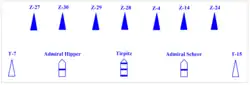 The German squadron that set sail consisted of the battleship Tirpitz, heavy cruisers Admiral Scheer and Admiral Hipper, destroyers Z4 Richard Beitzen, Z14 Friedrich Inn, Z24, Z27, Z28, Z29, Z30, and torpedo boats T7 and T15.[6] Schneewind selected the fairway to the west of Rolvsøy Island as the optimal route for accessing the open sea, rather than the eastern skerry fairway prescribed by the higher command, which afforded access to the open sea in the vicinity of Porsangerfjorden. Schneewind's reasoning was that he considered the eastern channel to be more dangerous, both in terms of enemy submarines and the risk of mines being detonated. However, the route chosen by Schneewind took the German squadron into the area of the patrolling submarine K-21.[7] At 16:06, the squadron commenced its transit across the open sea, increasing its speed to 24 knots[Note 2] and reorganising its formation in accordance with the anti-submarine defence protocol. This entailed a frontline formation with torpedo boats positioned at the flanks, preceding the heavy ships. Such a formation forced the submarine attacking from a forward course (and attacking fast surface ships was only possible from a submarine's underwater position) to lower its periscope and increase its depth to avoid being detected and attacked by the destroyers; but after passing the destroyers, the submarine had no time to organise a successful attack on the protected heavy ships. An attempt by a submarine to evade the order had a similar result - it simply did not have enough time to get within torpedo range of the attacked ships, the squadron literally whizzed past the submarine.[8] To reduce the risk of torpedoing the destroyers, at 16:46 Schneewind ordered them to move in a small zigzag. The heavy ships continued to move without zigzagging.[9] Furthermore, the Ar 196 seaplane was launched from the battleship Tirpitz with the objective of searching for enemy submarines.[10] The squadron proceeded on a course of 30° (north-northeast), with the intention of reaching a distance of 25 miles from the coast as expeditiously as possible, given that the risk of submarine attack was greatest in this area.[11] The distance between the heavy ships was initially 2,000 metres, but at 16:47 it was increased to 3,000 metres.[9]