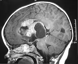 31. ^ Burger PC, Yu IT, Tihan T, Friedman HS, Strother DR, Kepner JL, et al. (September 1998). "Atypical teratoid/rhabdoid tumor of the central nervous system: a highly malignant tumor of infancy and childhood frequently mistaken for medulloblastoma: a Pediatric Oncology Group study". The American Journal of Surgical Pathology. 22 (9): 1083–1092. doi:10.1097/00000478-199809000-00007. PMID 9737241.