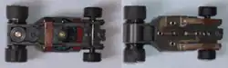 | 1976 | G-Plus | Innovative in-line motor design that increased speed as well as magnetic exposure to the track rails. This chassis allowed for detailed open wheel Formula 1 style car bodies in its narrow version. | |