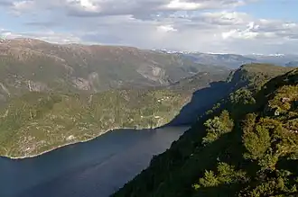 Austfjorden is a fjord in Vestland county, Norway. The 20-kilometre (12 mi) long fjord runs along the border between Alver Municipality and Masfjorden Municipality. It starts in Alver and extends to the northwest. The Masfjorden joins the Austfjorden from the north, and then the Austfjorden empties into the Fensfjorden before reaching the open sea near Fedje. The Austfjorden is the innermost arm of the Fensfjorden. The village of Knarrviki and the Mongstad industrial area lie on the western shore of the Austfjorden. The village of Myking lies on the western shore of the fjord, near the innermost part of the fjord.[1]