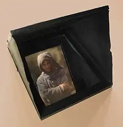 Stereoscopic Autochromes were especially popular, the combined color and depth proving to be a bewitching experience to early 20th-century eyes. Usually of a small size, they were most commonly viewed in a small hand-held box-type stereoscope. Larger, non-stereoscopic plates were most commonly displayed in a diascope, which was a folding case with the Autochrome image and a ground glass diffuser fitted into an opening on one side, and a mirror framed into the other side. The user would place the diascope near a window or other light source so that light passed through the diffuser and the Autochrome, and the resulting back-lit, dark-surrounded image would be viewed in the mirror. Slide projectors, then known as magic lanterns and stereopticons, were a less common but especially effective display technique, more suitable for public exhibitions. Projection required an extremely bright and therefore hot light source (a carbon arc or a 500-watt bulb were typical) and could visibly "fry" the plate if continued for more than two or three minutes, causing serious damage to the color.[9] Many surviving Autochromes suffer from such "tanning" and conventional projection is not a recommended means of displaying these irreplaceable images today.