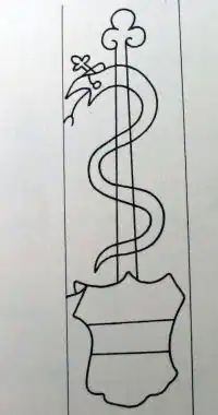 Paper C is the oldest used in the manuscript.[11] Its watermark depicts a rather thick snake, resembling the stance and curvature of a seahorse, with its head bent beyond the axis towards the margin, while its tail points in the opposite direction, although its end is also directed towards the margin.[11] On the snake's head, there is a fleur-de-lis resembling a crown, and a tongue protrudes from its mouth directed upwards and ending in a blade-shaped tip.[11] The snake's body is divided by a dorsal line into two parts, which are further divided into segments by oblique horizontal lines descending downwards.[11] In Charles Briquet's catalogue, the most similar watermark is cataloged as number 10,738.[13][14]