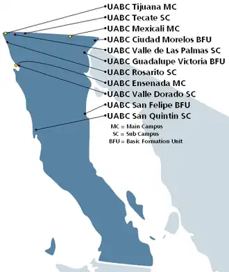 The Autonomous University of Baja California (UABC) has three main campuses, five sub campuses and three Units of Basic Formation outside the three 3 main facilities.