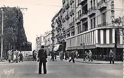 Sixty meters wide, it has two unpaved roads on both sides of a median strip planted with, until 2001, a quadruple range of ficus trees (reduced to two rows in a major 2000–2001 renovation).[9] Important private buildings such as The Coliseum (galleries, cafes and movie theatres) in 1931 and the Hotel Claridge in 1932 came to be built.[10] At the advent of independence in 1956, the statue was toppled and the avenue was renamed after the new president Habib Bourguiba.[11] New private buildings emerged from extensive investments, such as international hotels.
