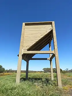 In the Shire of Perenjori, the Caron coal stage, dating from 1930, is also state heritage listed. The Caron coal stage is the only coal stage in Western Australia to be built from concrete.[24][25] During the steam age of the railway line, Caron was a major hub because of its reliable water supply, which made it an important watering point on the line. Apart from the coal stage it also has a still existing railway dam and had an engine turntable, railway barracks and four railway cottages, but nothing remains of these installations. Caron was also where train crews changed over and, from 1936, it had a refreshment room and bar for the crews, but these were destroyed by fire in 1949. With the change from steam to diesel engines in 1957, Caron's importance greatly declined.[26]