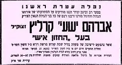 - ^ Haaretz, "Rabbi Karelitz ('the Chazon Ish') has passed away", October 25, 1953, p. 63.