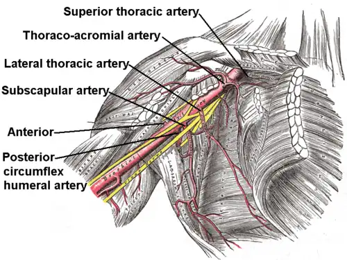The axillary artery is often referred to as having three parts,[1] with these divisions based on its location relative to the pectoralis minor muscle, which is superficial to the artery.