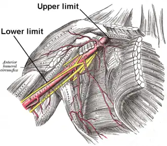 Axillary artery and its branches—anterior view of right upper limb and thorax. Upper and lower limits labeled.