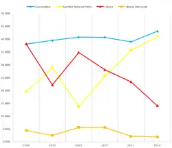 Historically the Ayr seat has held a higher level of support for the Conservative Party in comparison to elsewhere in Scotland and the United Kingdom as a whole. The equivalent Westminster constituency of Ayr was gained by the Conservative Party at its creation in 1950. In subsequent elections the seat went on to return Conservative MP's to Parliament until the 1997 UK general election, when the boundaries of the constituency were altered in a move involving the transfer of a number of Conservative-voting suburbs towards the south of Ayr to the adjoining Carrick, Cumnock and Doon Valley constituency, which subsequently altered the demographics of the Ayr constituency - benefiting the Labour Party. In spite of this, at the 1997 election, the Ayr seat returned one of the smallest pro-Labour swings in Great Britain at just over 5%.[6] Prior to this the Ayr Burghs constituency (which incorporated a number of towns in coastal Ayrshire including Irvine, Troon, Prestwick, Ayr, Saltcoats and Ardrossan) continuously returned Conservative MP's to Parliament from 1906 until its abolishment in 1950, making Ayr the longest seat to be held continuously by the Conservatives in Scotland (continuously having a Conservative MP at Westminster for 91 years).