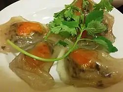 Bánh bột lọc are small, clear-looking, chewy tapioca dumplings in Vietnamese cuisine that can be eaten as appetizers or small snacks. They are usually filled with shrimp and pork belly, often being topped with fried shallots and served with sweet chili fish sauce. They are said to have originated from Huế, as the city was once the imperial capital of the Nguyễn dynasty and known for having simple, yet sophisticated dishes.[1][2]