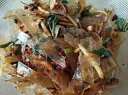Bánh tráng trộn (meaning mixed rice paper or rice paper salad[1] in Vietnamese), is a popular Vietnamese street food made of bánh tráng mixing with a varieties of other ingredients. Originated as a snack for school students, bánh tráng trộn has since gained popularity in all over Vietnam and with oversea Vietnamese communities.[2][3][4][5]
