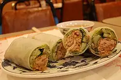 In Vietnamese cuisine, bì cuốn are pork and rice rolls. They are made from thinly shredded pork and skin, with rice, and ingredients often added are garlic sauce, lemon, sugar, chilli, pickles, and white radish and carrots.[1]