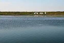 Büyükçekmece Dam was built to supply residential water to Istanbul. The construction started in 1983, and the dam was completed in 1988.[1] Water supply from the dam's reservoir went into service in 1989.[2] It is located in Büyükçekmece district on the European part of Istanbul on the Lake Büyükçekmece,[1] which is formed by disconnecting the stream Sarısu's outflow to the Marmara Sea.[2] It is an earth-fill embarkment dam of 13 m (43 ft) height.[1] The dam's catchment area is 620 km2 (240 sq mi).[2] The reservoir has a capacity of 162 hm3 (5.7×109 cu ft) covering a surface of 43 km2 (17 sq mi) at normal pool.[1] The reservoir water is sanitated before it is supplied to the households. Annual water supply capacity of the dam is 100,000,000 m3 (3.5×109 cu ft).[2]
