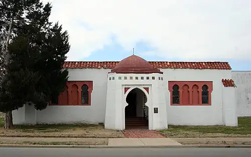 The synagogue is a stuccoed brick, one-story building constructed in the Spanish Colonial Revival style with Islamic influences. The building is covered in white stucco and red mission tiles. The building has a flap sloping roofline and red tiles along the parapet. A dome constructed of red painted sheet metal squares. A symmetrical band of decorative ceramic mosaic tiles form the base of the dome. Recessed Islamic pointed horseshoe arches provide openings on all three sides. Diamond pane casement windows with Islamic detail are arranged in the sides of the portico. To the south lies a gated area made of wrought iron with the Star of David molded into the iron.[6][7]