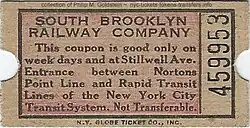 The streetcar line that ran from Sea Gate/Norton's Point to Coney Island was operated by the New York and Coney Island Railroad (NY&CI). It first started operating on June 9, 1879 as a steam line to connect Norton's Point to the Culver Terminal, which allowed passengers traveling on ferryboats to and from New York City (which only consisted of Manhattan at the time) have easy access to the beach. In 1899, the line was electrified, renamed to the Coney Island-Norton's Point Line and became a part of the South Brooklyn Railway, with the steam cars substituted for el cars.[3] On July 3, 1910, the el cars were replaced with streetcars, although from May 1918 to October 1919, they reverted back to using el cars.[4]In May 1918, through-running service between the Culver Line and the Norton's Point Line (and therefore service east of Stillwell Terminal) was discontinued, although the elevated ramp to the terminal was retained.[5]In 1929, the west end of the Norton's Point Line was connected with physical trackage to the Sea Gate Line.[3]