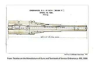 The internal dimensions of Mk V were the same as those of Mk IV, and the outline was practically the same. The construction differed because of a liner and α-tube in the A-tube. It was therefore not hooped up to the muzzle. The short hoops over the breech were replaced by a hoops in one length.[2] In 1886, Brassey dubbed the construction of Mk V as having the chase made of a double tube.[14]