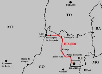 BR-080 is a federal highway of Brazil.[1] The road was originally planned to connect Brasília to São Gabriel da Cachoeira in Amazonas state near the Colombian border, an extent of 3,250 km (2,020 mi). Currently, however, it only reaches about 569 km (354 mi) to Luiz Alves, in the city of São Miguel do Araguaia in Goiás, on the border with Mato Grosso.[2]