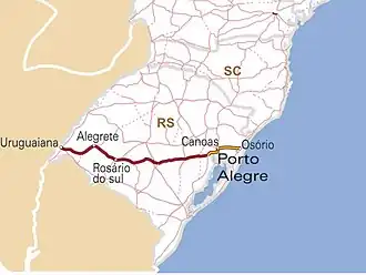 The BR-290 (officially Osvaldo Aranha Highway) is an important highway in the Rio Grande do Sul state of Brazil. Approximately 726km long, the highway runs from the port city of Osório westward to the city of Uruguaiana, on the border of Argentina.[2]