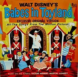 Walt Disney's Babes In Toyland (Disneyland Records ST-3913 / DQ-1219) was the original record album for the 1961 film adaptation. However, it is a cover version rather than an authentic soundtrack album. The actors in the film are replaced by uncredited singers for this album, but Ann Jillian, from the film's cast, is featured on Never Mind, Bo Peep, and Ed Wynn, also from the film, is featured on the "Workshop Song". Ray Bolger as Barnaby in "We Won't Be Happy Till We Get It" and "Castle in Spain" is replaced by Thurl Ravenscroft. A single with Annette's songs was also available.