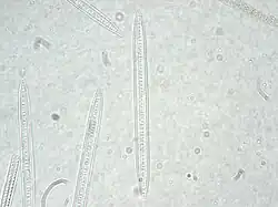 Bacillaria have a unique form of colonial motility among diatoms.[3] Individual cells (with their long axes parallel to one another) slide against their neighbors in a coordinated fashion, allowing the entire structure to expand or contract.[4]