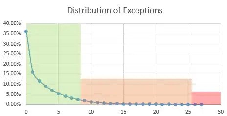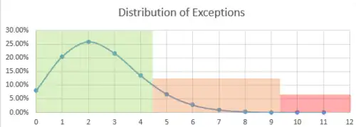 For a Value at Risk 1-day at 99% backtested 250 days in a row, the test is considered green (0-95%), orange (95-99.99%) or red (99.99-100%) depending on the following table:[3]