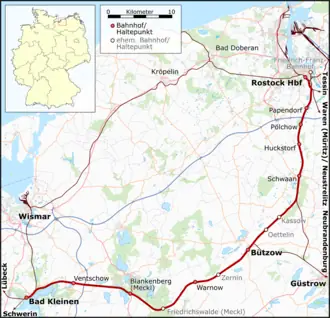 The Bad Kleinen–Rostock railway is a double track electrified railway in the German state of Mecklenburg-Vorpommern. The LudwigslustBad Kleinen section of the line is double track. The line was opened in 1850 by the Mecklenburg Railway Company (German: Mecklenburgische Eisenbahngesellschaft) and is one of the oldest railways in Germany and is part of the LeipzigMagdeburgSchwerinRostock main line.
