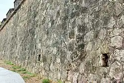 Curtain wall in the corner, or counterguard, made of ashlars with marks of cannonball impacts and embrasures for rifles -