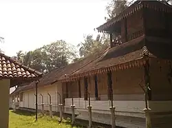 The devalaya consists of a Pilimageya (Shrine room), kitchen, Sinhasanaya (Chamber of Throne) and the abode of priest. The roof of the devalaya is supported on carved timber columns and the outside of the walls are adorned with Kandyan era paintings. The Sinhasanaya which was used by kings to watch the processions, is situated at the front of the devalaya. The wood carvings of the Sinhasanaya are reported to be similar to the carvings at Embekka Devalaya.[6]