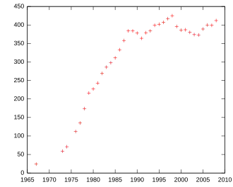 Government registration of the Baháʼí community showed 412 Baháʼís by the end of 2008.[18] Iceland has the second most number of Baháʼís per capita in Europe at 1493 per million population, and has the most number of Baháʼí Local Spiritual Assemblies at 49 per million.[1] The Association of Religion Data Archives (relying on World Christian Encyclopedia) estimated some 616 Baháʼís in 2005.[53]