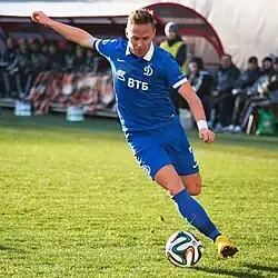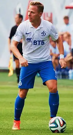 On 16 October 2014, it was revealed that Dynamo Moscow are planning to offer to extend Dzsudzsák's contract. At the time, Dzsudzsák earned €2.6 million, but the club was willing to raise his salary to €3.2 million. This means that Dzsudzsák would be able to earn 2.7 million HUF/daily.[29] Although Dzsudzsák scored a goal in the 50th minute against Lokomotiv Moscow in the Moscow derby, Dynamo lost the match 4–2 on 2 November 2014 in the 2014–15 Russian Premier League season.[30] On the 17th matchday of the Premier League season, Dzsudzsák scored a goal and gave two assists against Amkar Perm at the Arena Khimki.[31] On 10 December 2014, before the final match of the 2014–15 Europa League group stage match against his former club PSV, Dzsudzsák was honoured by his former club by displaying his footprint at the museum of the club.[32] On 19 December 2014, Dzsudzsák was awarded the best Hungarian football player of the year 2014 by the journalist of the Hungarian sport journal, nb1.hu. Dzsudzsák finished first (receiving 111 points), while Roland Juhász (92 points) second and Zoltán Gera third (44 points).[33] On 23 December 2014, Itasportpress.it revealed that Bundesliga club Borussia Dortmund showed interest in signing Dzsudzsák due to the possible financial problems of the Russian Premier League clubs including Dynamo Moscow. Previously, Dzsudzsák was linked with Serie A club Lazio and English Premier League clubs, including Liverpool and Everton.[34][35][36][37][38] On 15 January 2015, Dzsudzsák was linked again with Lazio.[39][40]