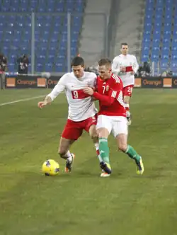 Dzsudzsák made his Hungary debut on 2 June 2007 in Heraklion against Greece. His first international goal came on 24 May 2008, incidentally in a match against Greece again.[51] His fourth goal was a 94th-minute winner against Finland on 12 October 2010.[52][53] Dzsudzsák scored his fifth goal against Lithuania in a friendly match in the Stadion Sóstói. He has scored three of his goals in the final three games in 2010, two of which were UEFA Euro qualifiers. Dzsudzsák scored the third goal of the four goals against Iceland at the Puskás Ferenc Stadium. The match finished 4–0.[54] On 10 September 2013, Dzsudzsák scored his a goal wearing the national team's shirt in a 5–1 victory over Estonia in the 2014 FIFA World Cup qualification match at the Puskás Ferenc Stadium.[55][56][57]