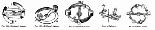 Modern (2007) watch balance wheels are usually made of Glucydur, a low thermal expansion alloy of beryllium, copper and iron, with springs of a low thermal coefficient of elasticity alloy such as Nivarox.[1] The two alloys are matched so their residual temperature responses cancel out, resulting in even lower temperature error. The wheels are smooth, to reduce air friction, and the pivots are supported on precision jewel bearings made of synthetic sapphire. Older balance wheels used weight screws around the rim to adjust the poise (balance), but modern wheels are computer-poised at the factory, using a laser to burn a precise pit in the rim to make them balanced.[2] Balance wheels rotate about 1+1⁄2 turns with each swing, that is, about 270° to each side of their center equilibrium position. The rate of the balance wheel is adjusted with the regulator, a lever with a narrow slit on the end through which the balance spring passes. This holds the part of the spring behind the slit stationary. Moving the lever slides the slit up and down the balance spring, changing its effective length, and thus the resonant vibration rate of the balance. Since the regulator interferes with the spring's action, chronometers and some precision watches have "free sprung" balances with no regulator, such as the Gyromax.[1] Their rate is adjusted by weight screws on the balance rim.