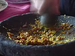Making Balinese basa gede bumbu using pestle and mortar