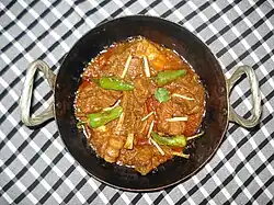 A balti or bāltī gosht (Urdu: بالٹی گوشت, Hindi: बाल्टी गोश्त) is a type of curry served in a thin, pressed-steel wok called a "balti bowl".[1] The name may have come from the metal dish in which the curry is cooked,[2][3] rather than from any specific ingredient or cooking technique.[4] Balti curries are cooked quickly using vegetable oil rather than ghee, over high heat in the manner of a stir-fry, and any meat is used off the bone. This combination differs sharply from a traditional one-pot Indian curry which is simmered slowly all day. Balti sauce is based on garlic and onions, with turmeric and garam masala, among other spices.[3]