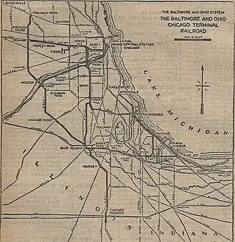 The B&O's South Chicago Station was located approximately at 94th Street and Commercial Avenue, slightly to the southwest of the Calumet River's opening to Lake Michigan. Additionally, the Pere Marquette Railway's Night Express to Muskegon and Grand Rapids, Michigan and its Resort Special to Bay View, Michigan, also used the B&OCT lines through the city, as well as the two stations on the approach to Grand Central Station. The B&O's 63rd Street Station, in the South Lynne section of the city was the company's other station within Chicago en route to Grand Central Station.[2][3][4]