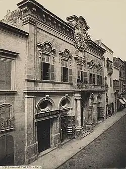 In 1841, the Banca Giuratale became a post office when the Packet Office was transferred there from the Casa del Commun Tesoro in Piazza Tesoreria. The Island Post Office was also transferred into the Banca Giuratale on 1 April 1849, and the two were merged into the General Post Office in 1885. A year later, the GPO moved to Palazzo Parisio.[11]