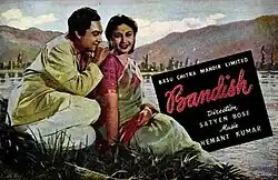Bandish (transl. Restriction) is a 1955 black and white Indian Hindi-language film[1] The film stars Ashok Kumar, Meena Kumari, Daisy Irani in lead roles. The film was directed by Satyen Bose.[2]