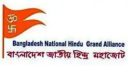 Bangladesh National Hindu Grand Alliance (abbreviation: BNHGA, in Bengali: বাংলাদেশ জাতীয় হিন্দু মহাজোট, romanised: Bāṅlādēś Jātiyō Hindu Môhājôte, abbreviation: BJHM), is a non-political, social Hindu religious organisation based in Bangladesh. It was formed as an alliance of 23 Hindu religious organisations of Bangladesh on 17 September 2006.[3] BJHM's main objectives are to consolidate the Hindu community, protect and serve Hinduism and to realise the religious, social, cultural and political rights of the Hindu community in Bangladesh.[4][5]