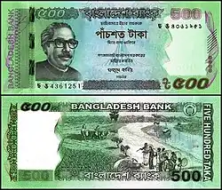 In 2011, Bangladesh Bank began issuing a new series of banknotes denominated in ৳2, ৳5, ৳100, ৳500, and ৳1000. All are dated 2011 and feature a portrait and watermark of the Father of the Nation, Bangabandhu Sheikh Mujibur Rahman, along the National Martyr's Monument in Savar at center front.[7]