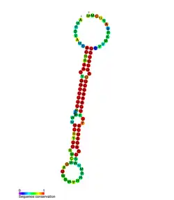 ![]() A secondary structure and sequence conservation diagram for Bantam microRNA. | |