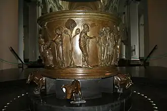 The basin is 91 centimetres (36 in) across at the top, tapering slightly towards the base, and is variously described as of brass or bronze.[21] It was made by lost wax casting, with the basin cast in a single piece; the size was not necessarily exceptional, as both church bells and cauldrons for large households were probably cast at comparable sizes; some church doors cast in a single piece, though flat, were much larger. The font sat on twelve oxen (two are now missing), who emerged from a stone plinth, a reference to the "molten sea... on twelve oxen" cast in bronze for Solomon's temple[22] The five scenes shown, identified by Latin inscriptions ("tituli") on the rim above and in the image field, can be read in chronological sequence:[23][24]