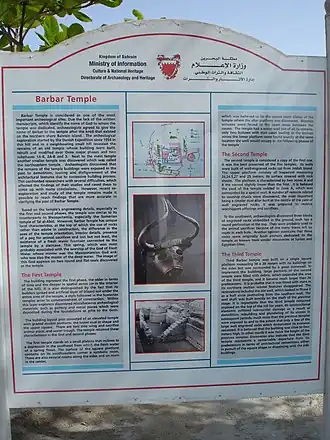The Barbar Temple (Arabic: معبد باربار, romanizedMaʻbad Bārbār) is an archaeological site located in the village of Barbar, Bahrain, considered to be part of the Dilmun culture. The most recent of the three Barbar temples was rediscovered by a Danish archaeological team in 1954. A further two temples were discovered on the site with the oldest dating back to 3000 BC. The temples were built of limestone blocks, believed to have been carved out from Jidda Island.[1]