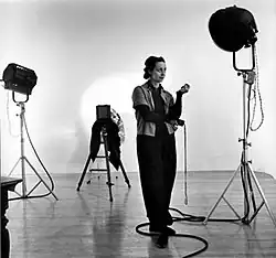 In response to Willard's Leica-illustrated articles, E. Leitz, Inc. offered him a job publicizing the new 35mm camera, and the couple moved to New York City in the summer of 1930. After one year traveling the east with Willard, Barbara set up a printmaking studio in 1931 on 23rd street opposite Washington Square Park in New York City. Carl Zigrosser of the Weyhe Gallery (NYC) exhibited her woodcuts and new lithographs of city themes. The impact of the city, its masses of people, traffic, buildings and the east, were in counterpoint to her memories of the Southwest. Out of this subject matter, symbolic forms emerged and she began to paint more abstractly, exhibiting her new work in a solo show at the Mellon Gallery in Philadelphia.[9] While at UCLA, Barbara had been offered a scholarship by Dr. Albert Barnes, so while traveling the east, she visited his art collection in Merion, Pennsylvania. As a form of study, he allowed Willard and Barbara to photograph his entire collection. While photographing a Sudan fertility icon and an Ivory Coast totemic mask, Barbara discovered that she could make these ritual sculptures seem either menacing or benign, simply by control of lighting. This experience of dramatization of controllable meanings by light manipulation became the prelude to her “psychological lighting” of dance for camera compositions.[9]
