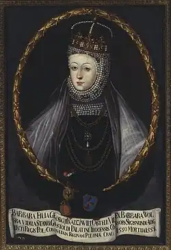 Barbara Radziwiłł (Polish: Barbara Radziwiłłówna, Lithuanian: Barbora Radvilaitė; 6 December 1520/23 – 8 May 1551) was Queen of Poland and Grand Duchess of Lithuania as the second wife of Sigismund II Augustus, the last male monarch of the Jagiellon dynasty. Barbara, a great beauty and already widowed, became a royal mistress most likely in 1543 and they married in secret in July or August 1547. The marriage caused a scandal; it was vehemently opposed by Polish nobles, including Queen mother Bona Sforza. Sigismund Augustus, assisted by Barbara's cousin Mikołaj Radziwiłł the Black and brother Mikołaj Radziwiłł the Red, worked tirelessly to gain recognition of their marriage and to crown Barbara as Queen of Poland. They succeeded and Barbara's coronation was held on 7 December 1550 at Wawel Cathedral. However, her health was already failing and she died just five months later. Even though it was brief, her reign propelled the Radziwiłł family to new heights of political power and influence.[1]