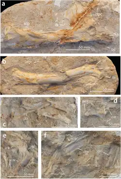 1. ^ Paul's estimate of the wingspan and body mass is actually written for Alcione in his book, based on his assumption that Barbaridactylus represents the adult stage of Alcione.[4] However, the 2018 study directly refutes this claim based on the hatchet-shaped deltopectoral crest different from Alcione; the wingspan of approximately 4 m (13 ft) is noted in the supplement of this study which concurs with Paul's estimate.[2]