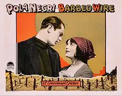 Barbed Wire is a 1927 American silent romance film set in World War I. It stars Pola Negri as a French farmgirl and Clive Brook as the German prisoner of war she falls in love with. The film was based on the 1923 novel The Woman of Knockaloe by Hall Caine.[1] Unlike the original novel, which is set at the Knockaloe internment camp in the Isle of Man, the film takes place in Normandy, France. Some plot alterations were made in the adaptation, including most importantly the insertion of a happy ending.[2]