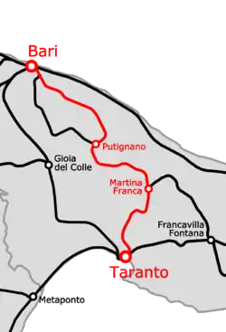 The Bari–Martina Franca–Taranto railway is a 113-kilometre (70 mi) long Italian railway line, that connects Bari with Putignano, Martina Franca and further to Taranto.